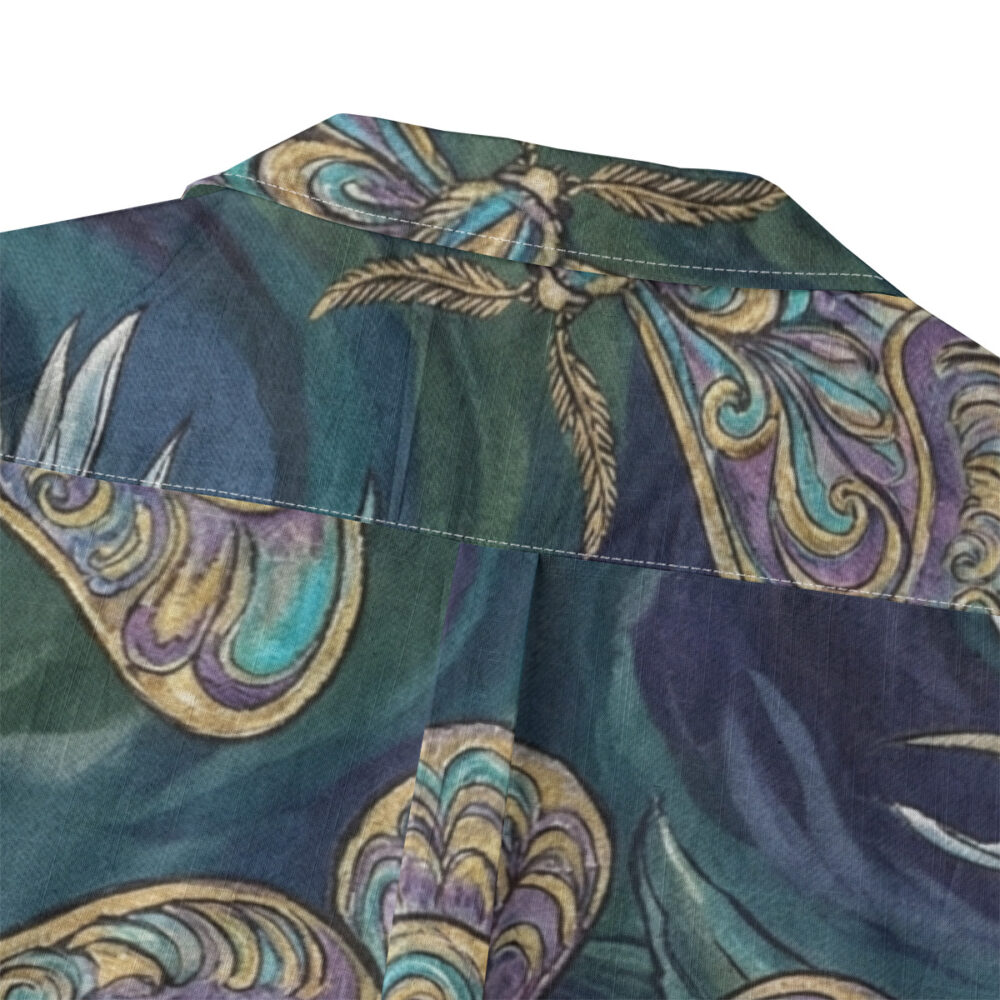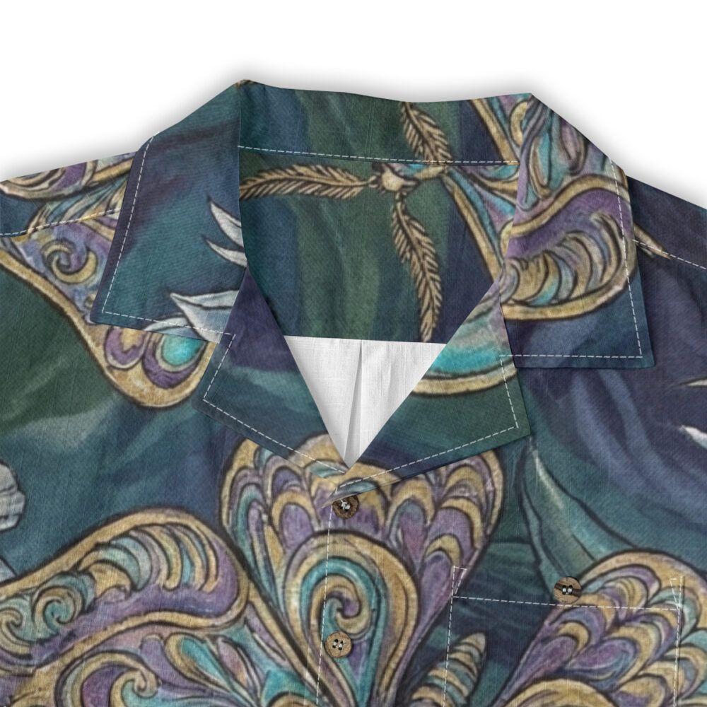 Rich teal, blue, and muted gold tones give the shirt an elegant nighttime island aesthetic.