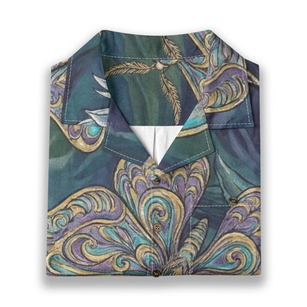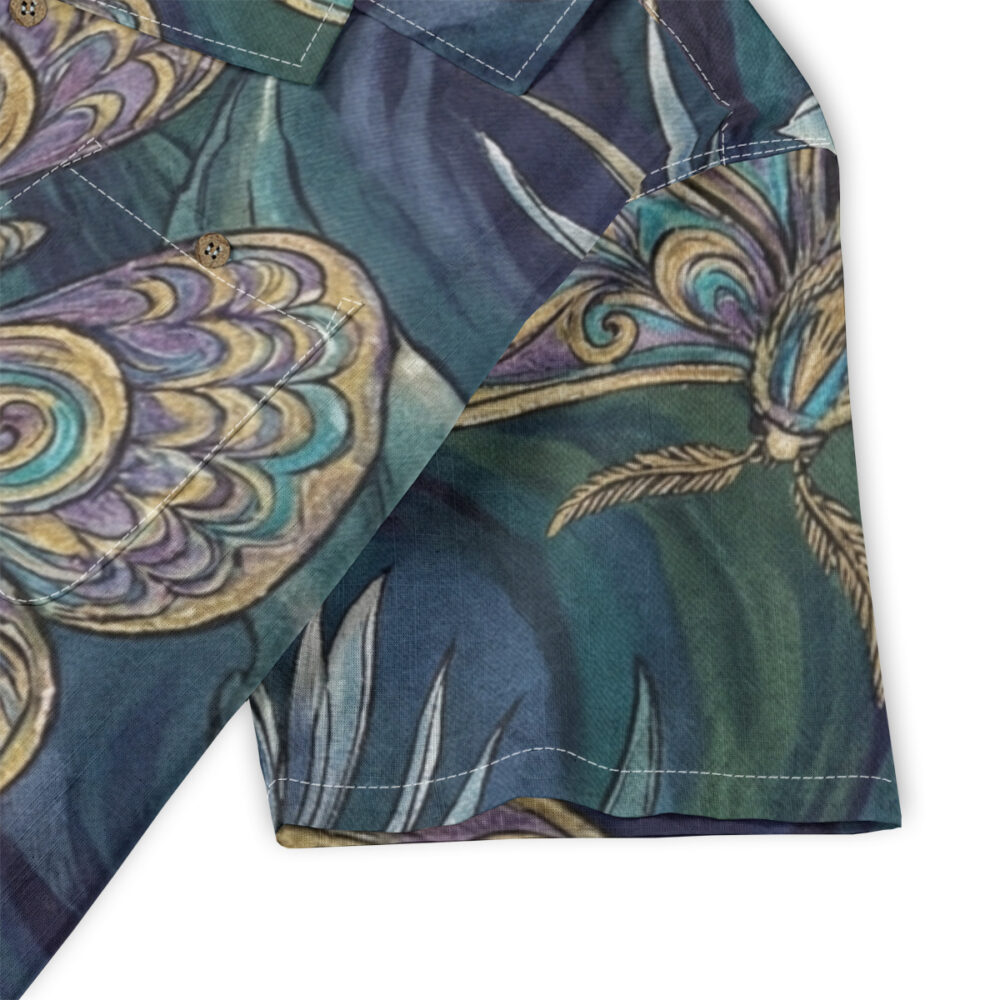 This Hawaiian Shirt features gracefully illustrated butterflies surrounded by soft floral elements on a deep, moody background.