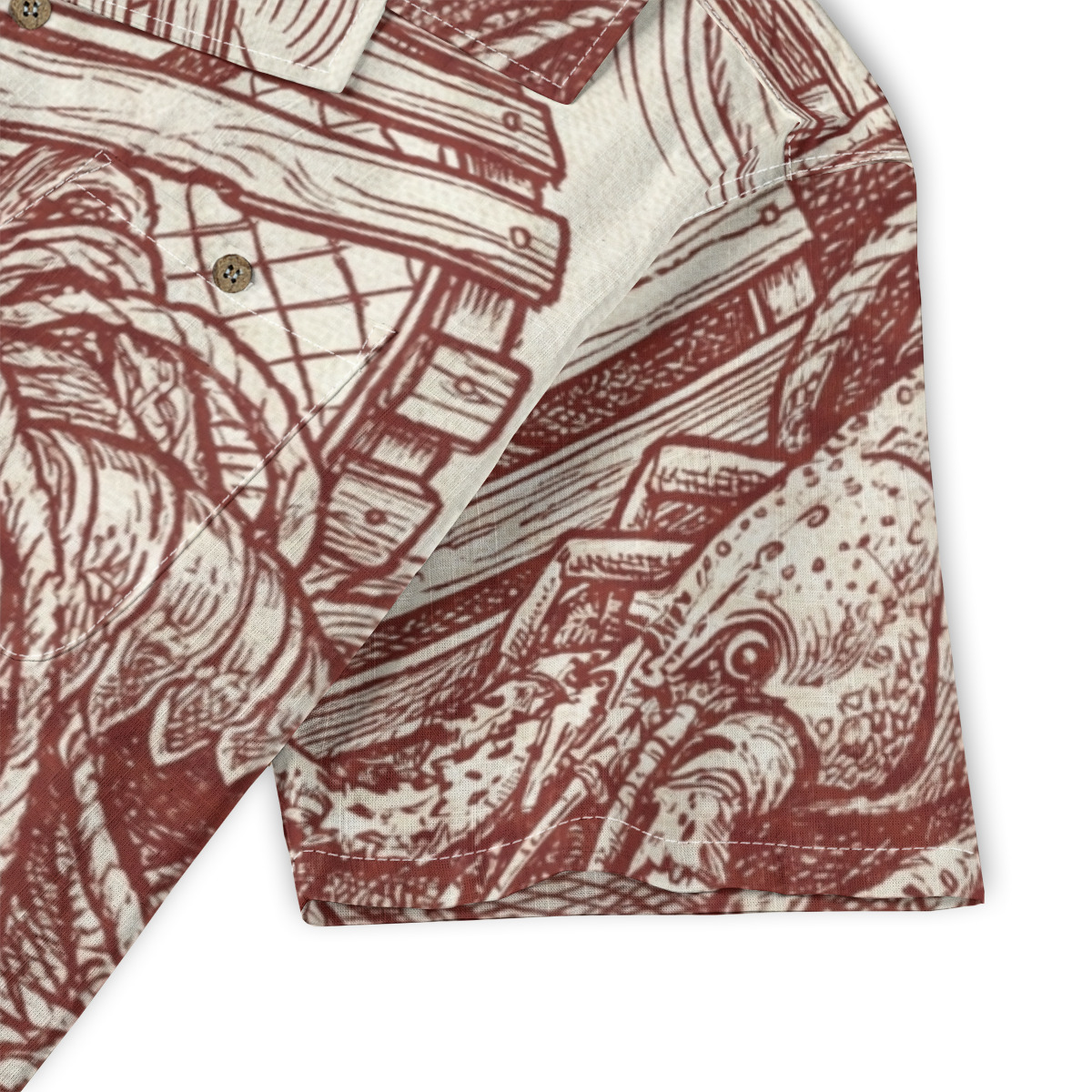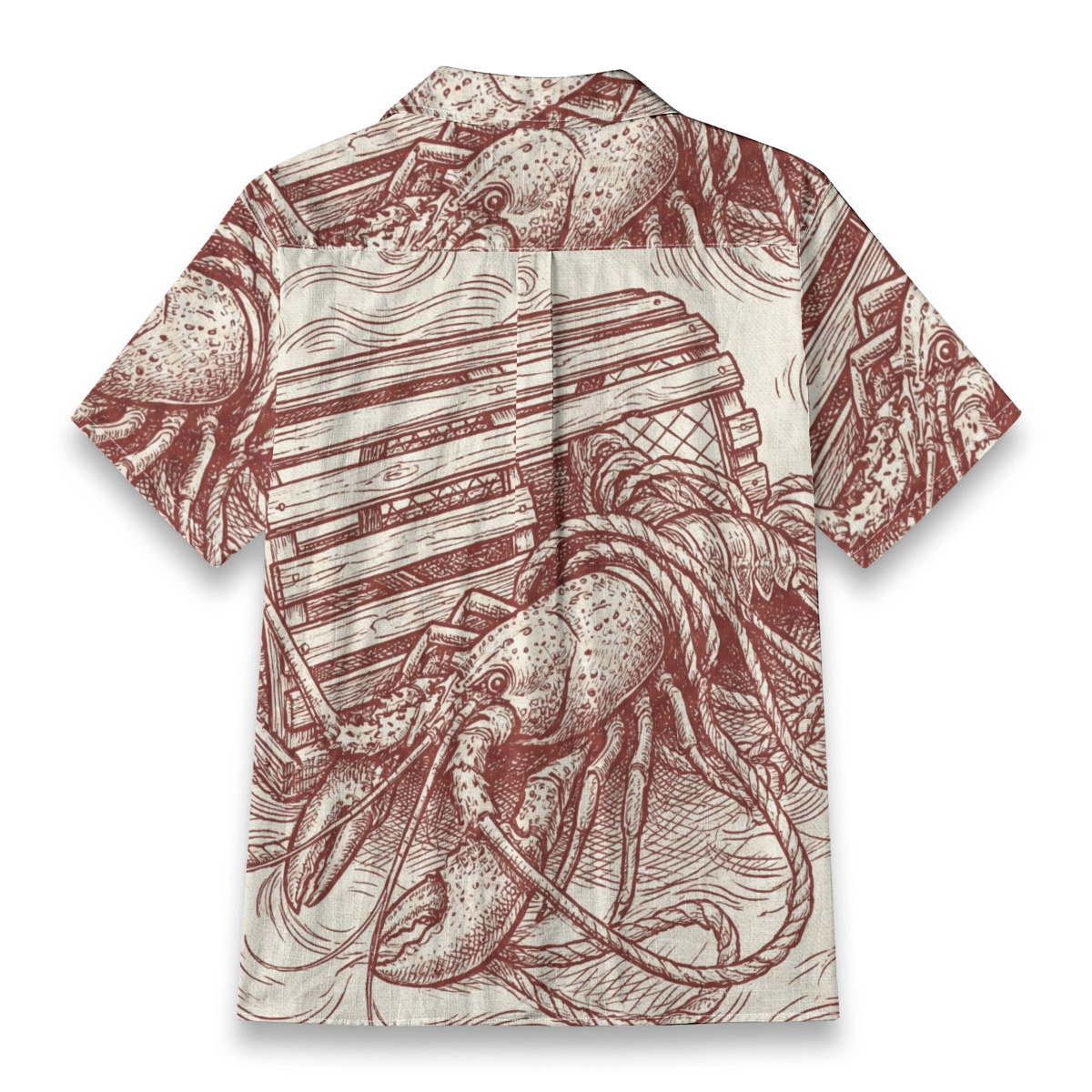 Inspired by classic maritime engravings, this Hawaiian shirt features a bold lobster illustration intertwined with ropes, crates, and ocean textures.